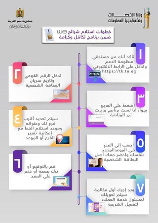 وتم فتح باب الحجز الالكتروني علي الرابط https://tk.te.eg لكافة مستفيدي برامج الدعم النقدي من الأسر والأفراد للتقديم وتحديد أقرب موعد لاستلام خطوط المحمول المجانية المخصصة لهم من أقرب فرع WE، أو ارسال كلمة “خط” علي الرقم 1442 لاستلامه في البيت بـ 15 جنيها مصاريف توصيل، حيث يتم عقب استقبال الرسالة بكلمة “خط” الرد برسالة “برجاء الرد برقمك القومي المكون من 14 رقمًا لتأكيد طلبك لاستلام الخط في البيت مقابل قيمة 15 جنيهًا مصاريف توصيل”، ويتم بعدها التأكيد برقم “1” او الرقم “2” لإعادة ادخال الرقم القومي، ثم يتم ارسال رسالة الانهاء “تم استلام طلبك بنجاح وسيتم التواصل معك لترتيب عملية التسليم في أقرب فرصة”.