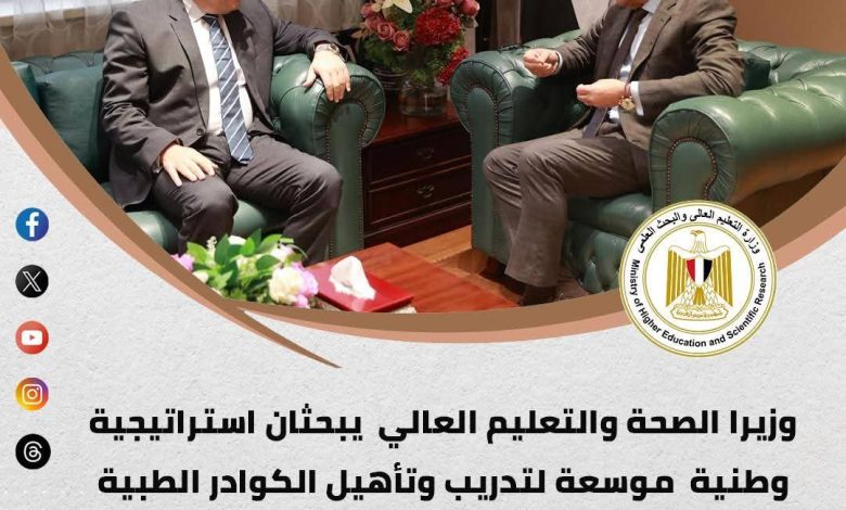 عقد الدكتور خالد عبدالغفار وزير الصحة والسكان والدكتور عبد العزيز قنصوه وزير التعليم العالي والبحث العلمي اجتماعًا لمناقشة استراتيجية تدريب أطقم المهن الطبية، ويأتي هذا الاجتماع في إطار توجيهات القيادة السياسية بالارتقاء بالمنظومة الصحية وتحسين جودة الخدمات المقدمة للمواطنين، وتمثل هذه الاستراتيجية ثمرة للتعاون المشترك والوثيق بين وزارتي الصحة والتعليم العالي، وبدعم ومتابعة حثيثة من مجلس النواب، تهدف الاستراتيجية إلى توحيد الجهود الوطنية لرفع كفاءة الكوادر الطبية وتوفير بيئة تدريبية مستدامة تواكب أحدث المعايير الصحية العالمية، وفي كلمته، أكد الدكتور عبدالعزيز قنصوة استمرار جهود الوزارة في الارتقاء بجودة الخدمات الصحية والتعليم الطبي، وتطوير منظومة المستشفيات الجامعية؛ بما يسهم في تحسين مستوى الرعاية الصحية المقدمة للمواطنين، إلى جانب دعم مسارات التعليم الطبي والبحث العلمي، مشيرًا إلى أن المستشفيات الجامعية تمثل ذراعًا أساسيًا للدولة في تقديم الخدمات الصحية.