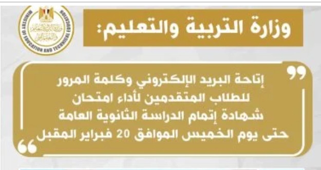 قالت وزارة التربية والتعليم والتعليم الفنى ، إنه في إطار حرص الوزارة على مصلحة طلبة وطالبات شهادة إتمام الدراسة الثانوية العامة، تعلن الوزارة إتاحة البريد الإلكتروني وكلمة المرور الخاصة بالطلاب المتقدمين لأداء الامتحان حتى يوم الخميس الموافق 20 فبراير المقبل، وذلك لتسجيل البيانات وطباعة استمارة التقدم الالكترونية.