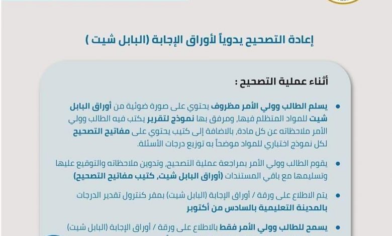 • يتم الاطلاع على ورقة / أوراق الإجابة (البابل شيت) بمقر كنترول تقدير الدرجات بالمدينة التعليمية بالسادس من أكتوبر