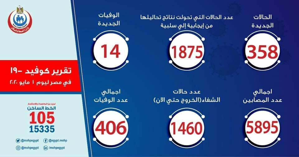 اعلنت وزارة الصحة اليوم  ارتفاع حالات الشفاء من مصابي فيروس كورونا إلى 1460 وخروجهم من مستشفيات العزل والحجر الصحي وارتفاع عدد الحالات التي تحولت نتيجة تحاليلها من إيجابية إلى سلبية لفيروس كورونا إلى 1875 : تسجيل 358 حالة إيجابية جديدة لفيروس كورونا..و14 حالة وفاة وأعلنت وزارة الصحة والسكان، اليوم الجمعة، عن خروج 79 من المصابين بفيروس كورونا من مستشفيات العزل والحجر الصحي، جميعهم مصريون، وذلك بعد تلقيهم الرعاية الطبية اللازمة وتمام شفائهم وفقًا لإرشادات منظمة الصحة العالمية، ليرتفع إجمالي المتعافين من الفيروس إلى 1460 حالة حتى اليوم. وأوضح الدكتور خالد مجاهد، مستشار وزيرة الصحة والسكان لشئون الإعلام والمتحدث الرسمي للوزارة، أن عدد الحالات التي تحولت نتائج تحاليلها معمليًا من إيجابية إلى سلبية لفيروس كورونا (كوفيد-19) ارتفع ليصبح 1875 حالة، من ضمنهم الـ 1460 متعافيًا. وأضاف أنه تم تسجيل 358 حالة جديدة ثبتت إيجابية تحاليلها معمليًا للفيروس، وذلك ضمن إجراءات الترصد والتقصي التي تُجريها الوزارة وفقًا لإرشادات منظمة الصحة العالمية، لافتًا إلى وفاة 14 حالة جديدة. وقال “مجاهد” إن جميع الحالات المسجل إيجابيتها للفيروس بمستشفيات العزل والحجر الصحي تخضع للرعاية الطبية، وفقًا لإرشادات منظمة الصحة العالمية. وذكر “مجاهد” أن إجمالي العدد الذي تم تسجيله في مصر بفيروس كورونا المستجد حتى اليوم، الجمعة، هو 5895 حالة من ضمنهم 1460 حالة تم شفاؤها وخرجت من مستشفيات العزل والحجر الصحي، و 406 حالات وفاة. وتواصل وزارة الصحة والسكان رفع استعداداتها بجميع المحافظات، ومتابعة الموقف أولاً بأول بشأن فيروس “كورونا المستجد”، واتخاذ كافة الإجراءات الوقائية اللازمة ضد أي فيروسات أو أمراض معدية، كما تم تخصيص الخط الساخن “105”، و”15335″ لتلقي استفسارات المواطنين بشأن فيروس كورونا المستجد والأمراض المعدية.