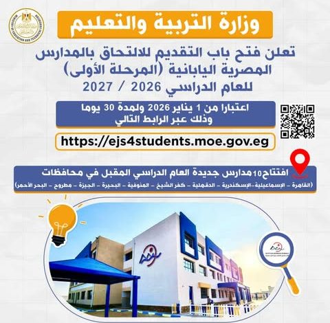 أعلنت الوزارة أيضًا فتح باب التقديم للطلاب بجميع المدارس المصرية اليابانية على مستوى الجمهورية للعام الدراسي 2026 / 2027، وذلك اعتبارًا من يوم الخميس الموافق 1 يناير 2026 ولمدة شهر كامل. التقديم يتم إلكترونيًا عبر الرابط الرسمي المخصص لذلك: https://ejs4students.moe.gov.eg/