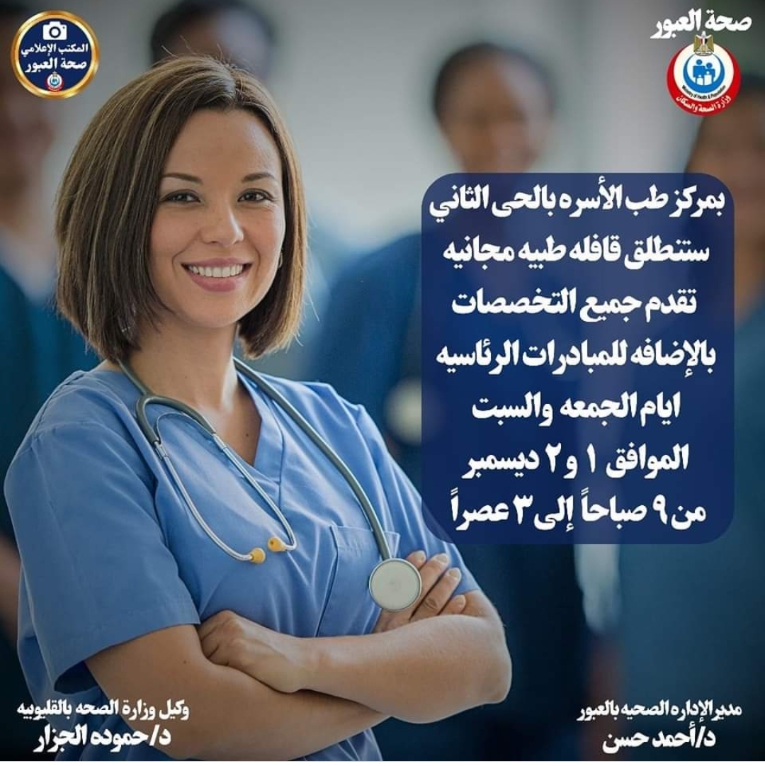وعن القوافل الطبية المجانية تعلن مديرية الشئون الصحية بالقليوبية عن إقامة القافلة الطبية المجانية بالحي الثاني بالعبور أيام الجمعة والسبت الموافق ١ و ٢من شهر ديسمبر.