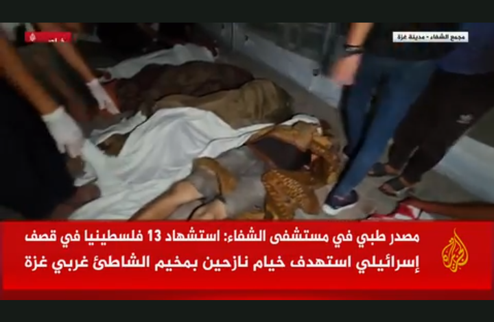 استشهد 13 فلسطينيا وأصيب آخرون جراء قصف إسرائيلي استهدف خيام النازحين في مخيم الشاطئ غربي مدينة غزة.