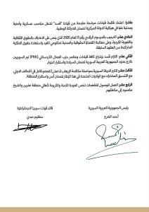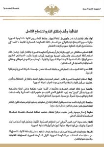 وقف إطلاق نار شامل وفوري على كل الجبهات ونقاط التماس بين القوات الحكومية السورية وقوات سوريا الديمقراطية بالتوازي مع انسحاب كل التشكيلات العسكرية التابعة لـ “قسد” إلى منطقة شرق الفرات كخطوة تمهيدية لإعادة الانتشار.