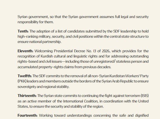 دمج كل العناصر العسكرية والأمنية لـ “قسد” ضمن هيكلية وزارتي الدفاع والداخلية السورية بشكل “فردي” بعد إجراء التدقيق الأمني اللازم، مع منحهم الرتب العسكرية والمستحقات المادية واللوجستية أصولاً، مع حماية خصوصية المناطق الكردية.