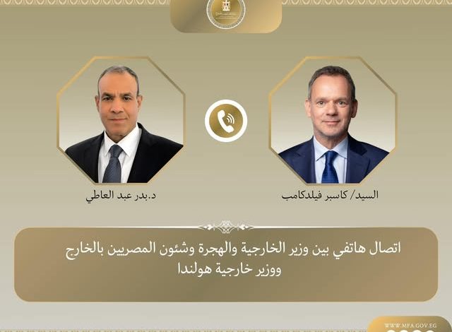 تلقى د. بدر عبد العاطي، وزير الخارجية والهجرة وشئون المصريين بالخارج، يوم الاثنين 18 أغسطس 2025، اتصالاً هاتفياً من السيد “كاسبر فيلدكامب” وزير خارجية هولندا، في إطار التشاور الدوري بشأن سبل تعزيز العلاقات الثنائية وتبادل الرؤى حول تطورات الأوضاع في قطاع غزة.