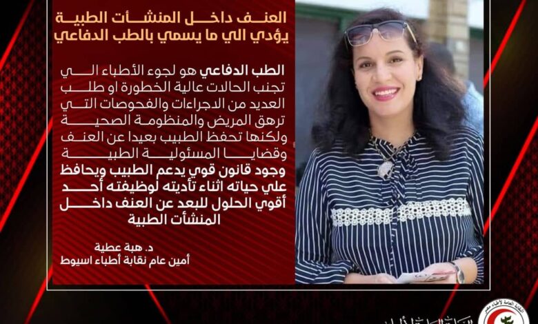 حذرت د.هبة عطية أمين صندوق أطباء أسيوط من لجوء الأطباء الى  الطب الدفاعي وهو ما يعني :  تجنب الحالات عالية الخطورة او طلب العديد من الاجراءات والفحوصات التي ترهق المريض والمنظومة الصحية ولكنها تحفظ الطبيب بعيدا عن العنف وقضايا المسئولية الطبية.