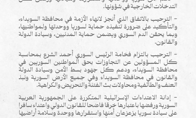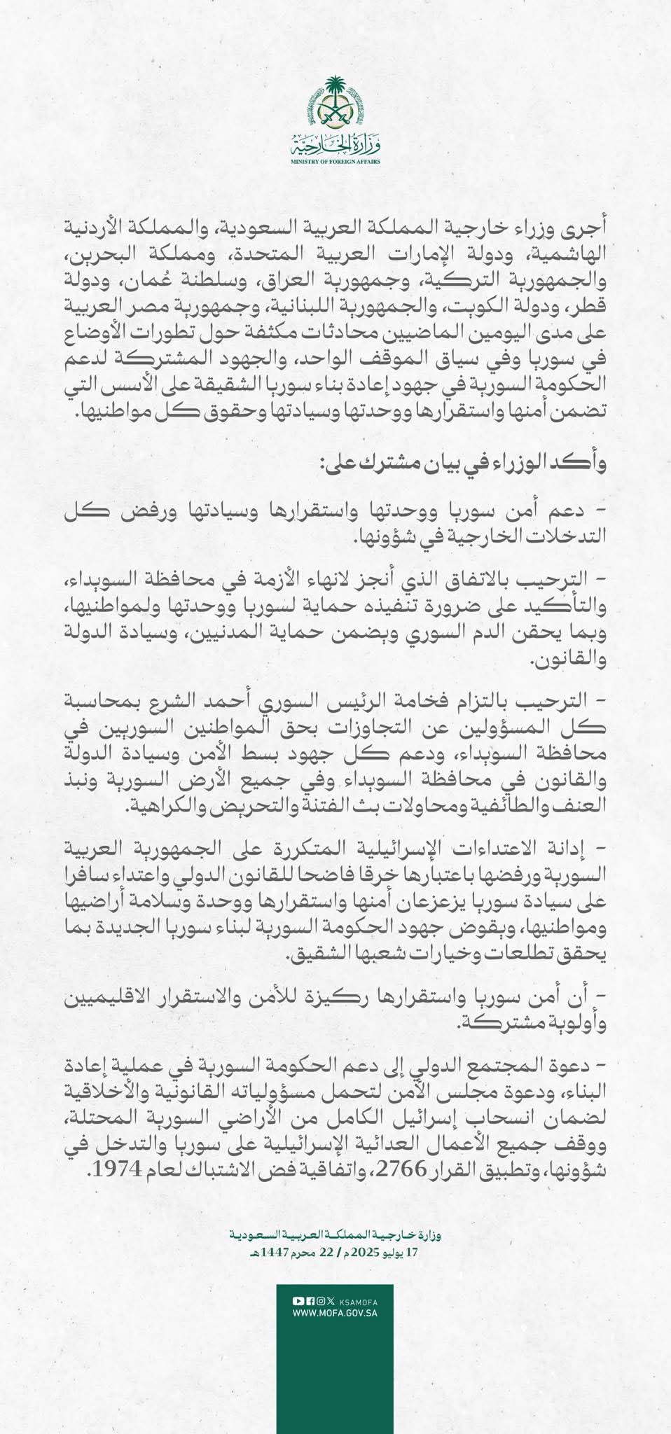 بيان صادر عن المملكة العربية السعودية، والمملكة الأردنية الهاشمية، ودولة الإمارات العربية المتحدة، ومملكة البحرين، والجمهورية التركية، وجمهورية العراق، وسلطنة عُمان، ودولة قطر، ودولة الكويت، والجمهورية اللبنانية، وجمهورية مصر العربية حول تطورات الأحداث في سوريا.