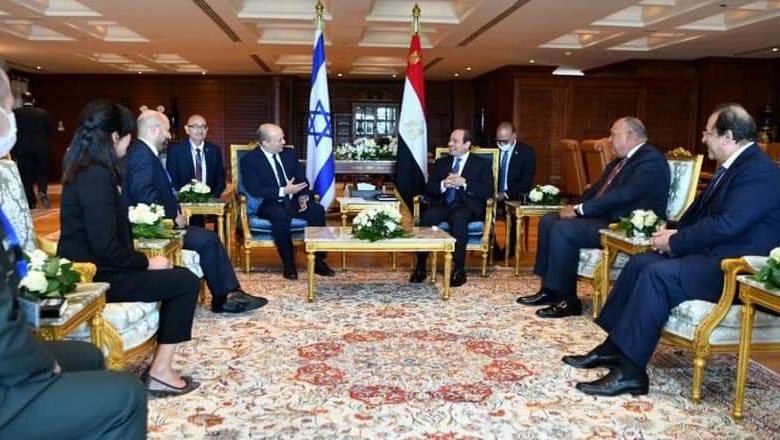 استقبل الرئيس عبد الفتاح السيسي اليوم الاثنين الثالث عشر من سبتمبر 2021. بمدينة شرم الشيخ رئيس الوزراء الإسرائيلي “نفتالى بينيت” وذلك بحضور سامح شكري وزير الخارجية والسيد عباس كامل رئيس المخابرات العامة، والدكتور آيال هولاتا رئيس مجلس الامن القومي الاسرائيلي والفريق اول آلي جيل السكرتير العسكري لرئيس الوزراء والسيدة شيمريت مائير كبيرة المستشاريين والسفيرة الاسرائيلية بالقاهرة.