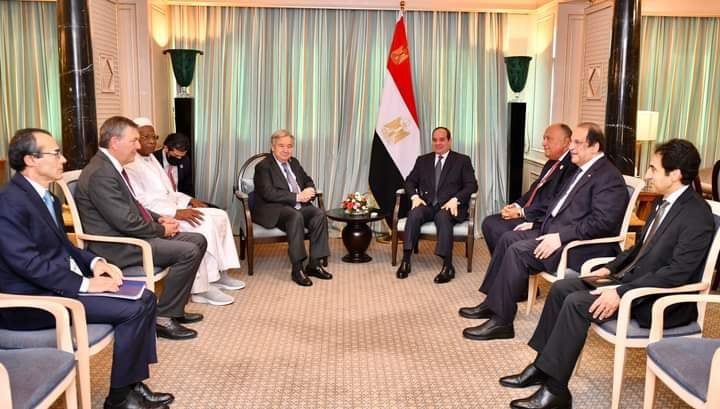 وصرح المتحدث الرسمي باسم رئاسة الجمهورية بأن الرئيس السيسي أعرب عن ترحيبه بلقاء سكرتير عام الأمم المتحدة مؤكداً سيادته حرص مصر على مواصلة تعزيز التعاون مع مؤسسات الأمم المتحدة في مختلف المجالات لدعم السلم والأمن الدوليين وكذا التنسيق مع المنظمة الأممية لتعزيز دورها الأساسي في معالجة القضايا ذات الأولوية للدول النامية.