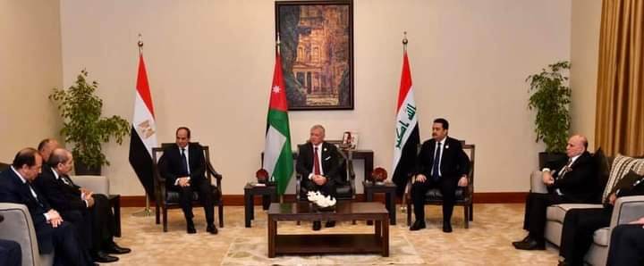 السادة الحضور إن انعقاد قمتنا اليوم يحمل معه دلالة سياسية هامة على اعتزامنا مواصلة توفير كافة سبل الدعم للعراق الشقيق ورغبة صادقة في الانتقال إلى مرحلة جديدة من الشراكة من خلال تعزيز العمل في أطر التعاون الثنائي أو المتعدد كآلية التعاون الثلاثي بين مصر والعراق والأردن أو غيرها.