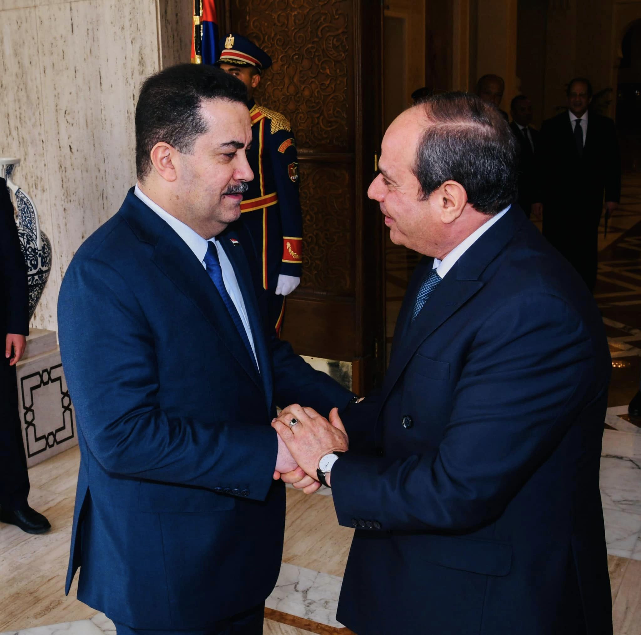 استقبل السيد الرئيس عبد الفتاح السيسي اليوم الأحد 5 فبراير 2023 السيد “محمد شياع السوداني” رئيس وزراء العراق، بحضور الدكتور مصطفى مدبولي رئيس مجلس الوزراء، والسيد سامح شكري وزير الخارجية، واللواء عباس كامل رئيس المخابرات العامة، والمهندس أحمد سمير وزير التجارة والصناعة، ومن الجانب العراقي الدكتور فؤاد حسين نائب رئيس مجلس الوزراء وزير الخارجية، والسيد آثير داود وزير التجارة، والدكتور أحمد الدليمي سفير جمهورية العراق بالقاهرة.