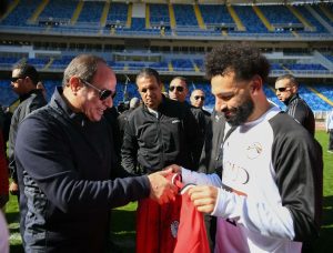 وقد قام اللاعب محمد صلاح قائد منتخب مصر بتقديم قميص الفريق إلى عبد الفتاح السيسي.