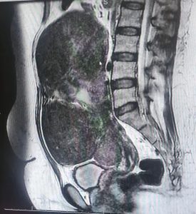 و بعد عمل الأشعة الصوتية و أشعة الرنين تبين وجود عدة أورام ليفية حميده تملىء تجويف البطن أكبرها بحجم اكثر من ٢٠ سنتيمترًا.