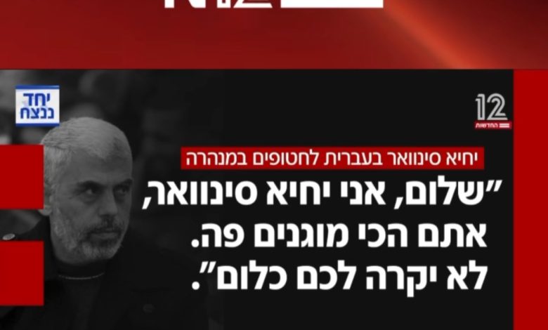 “احدى الاسيرات التي عادت من غزة، تم احتجازها مع مجموعة من الاسرى داخل احد الانفاق، فتح الباب وأذ بشخص ما يتحدث العبرية بطلاقة ويقول: مرحبا انا يحيى السنوار، انتم محصنون هنا لن يمسكم أي سوء” ( هذه ترجمة حرفية للشهادة نقلا عن القناة 12)
