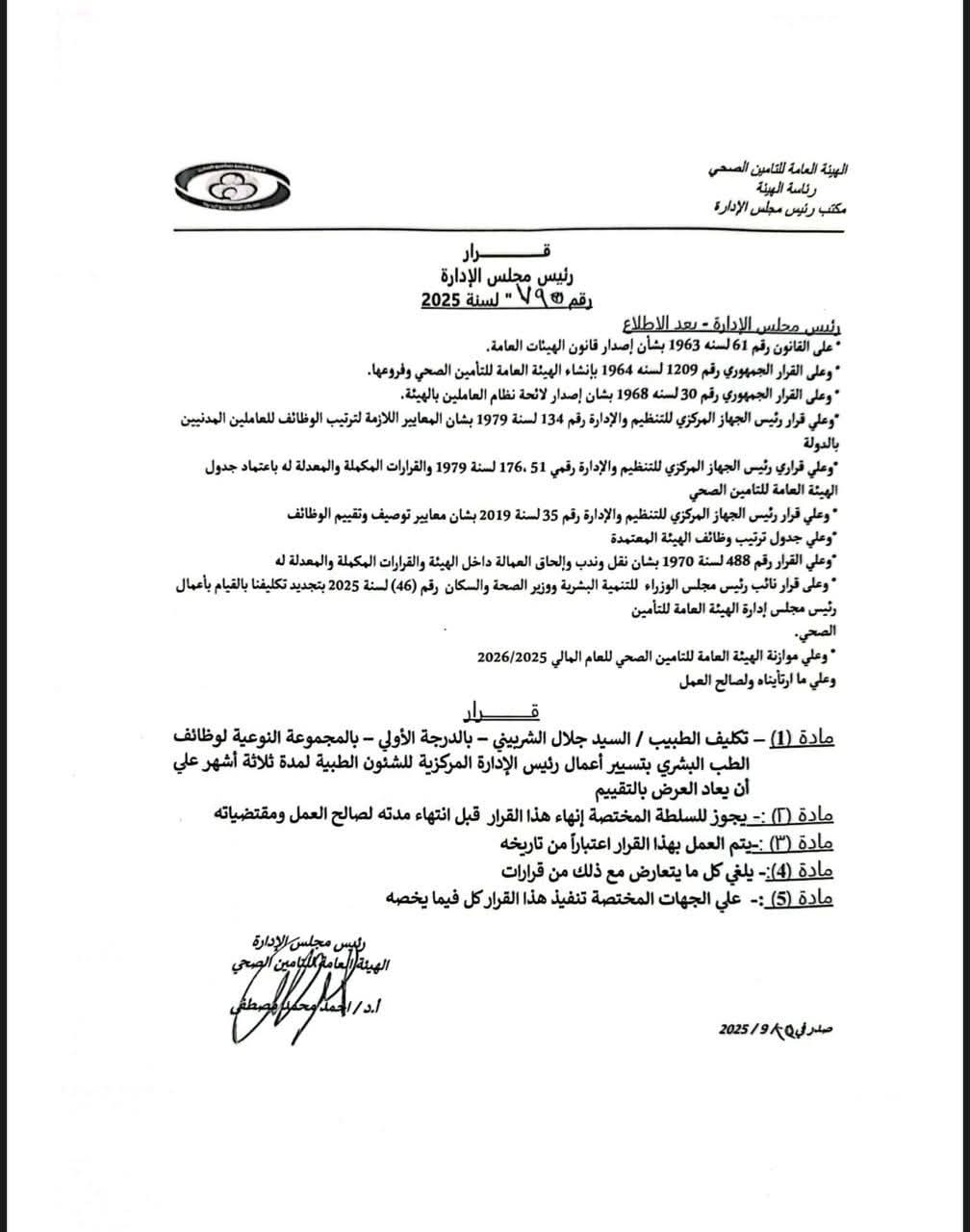 اصدر الدكتور أحمد مصطفى رئيس الهيئة العامة للتأمين الصحيقرارا بتعيين الدكتور السيد جلال الشربينى رئيسا للإدارة المركزيه للشئون الطبيه بالهيئه .