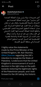 “أثمن تصريحات دولة رئيس وزراء المملكة المتحدة “كير ستارمر” حول توجه المملكة المتحدة نحو الاعتراف بالدولة الفلسطينية. وأؤكد على ان إعلان بريطانيا عن هذا القرار هو الخطوة الصحيحة على مسار استعادة الحقوق المشروعة للشعب الفلسطيني، واتطلع لاتخاذ المملكة المتحدة لهذا القرار التاريخي في اقرب وقت دون قيد او شرط. وأجدد موقف مصر الثابت بأن التسوية العادلة والشاملة للقضية الفلسطينية تعد السبيل الوحيد لتحقيق السلام المستدام في منطقة الشرق الأوسط.”