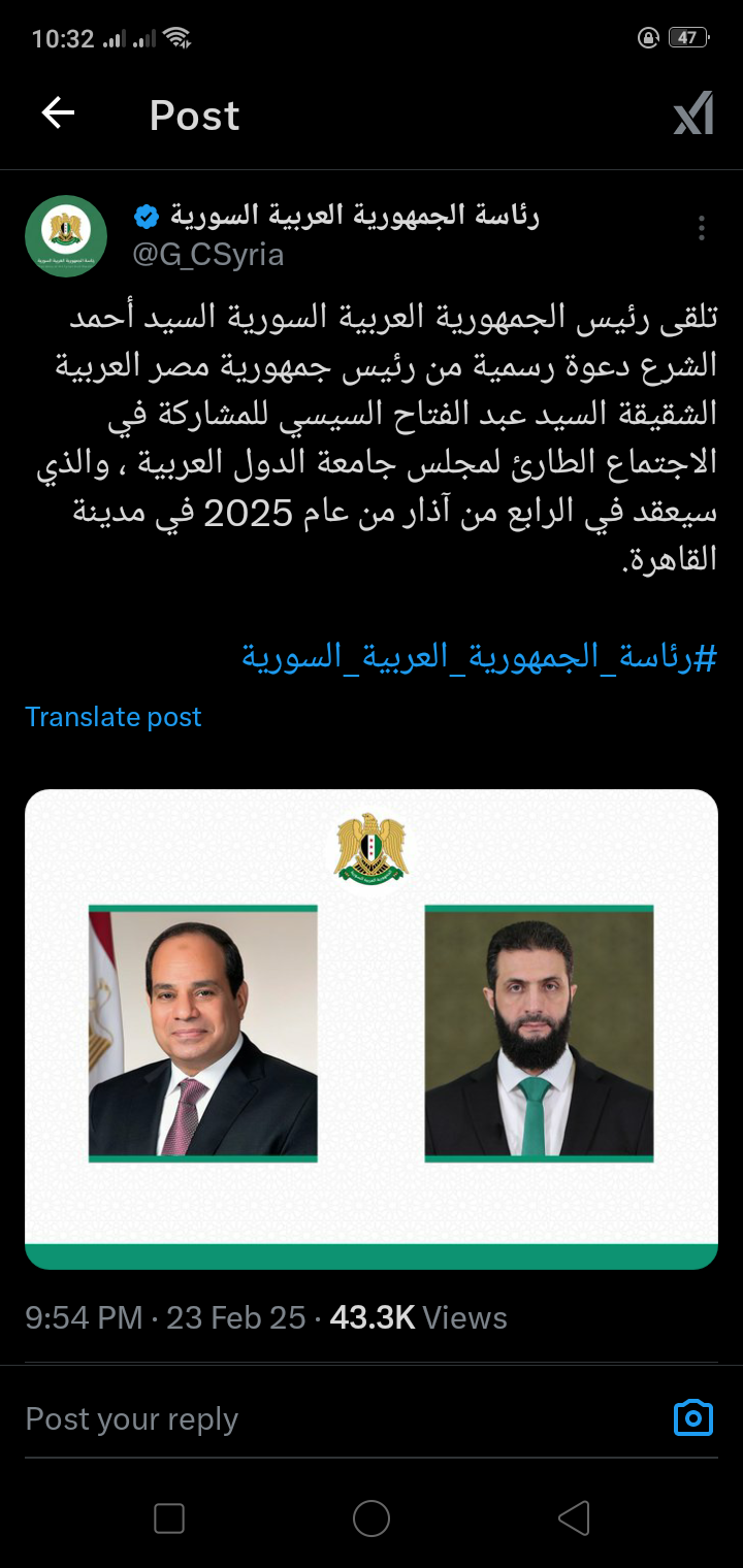 “تلقى رئيس الجمهورية العربية السورية السيد أحمد الشرع دعوة رسمية من رئيس جمهورية مصر العربية الشقيقة السيد عبد الفتاح السيسي للمشاركة في الاجتماع الطارئ لمجلس جامعة الدول العربية ، والذي سيعقد في الرابع من آذار من عام 2025 في مدينة القاهرة.”