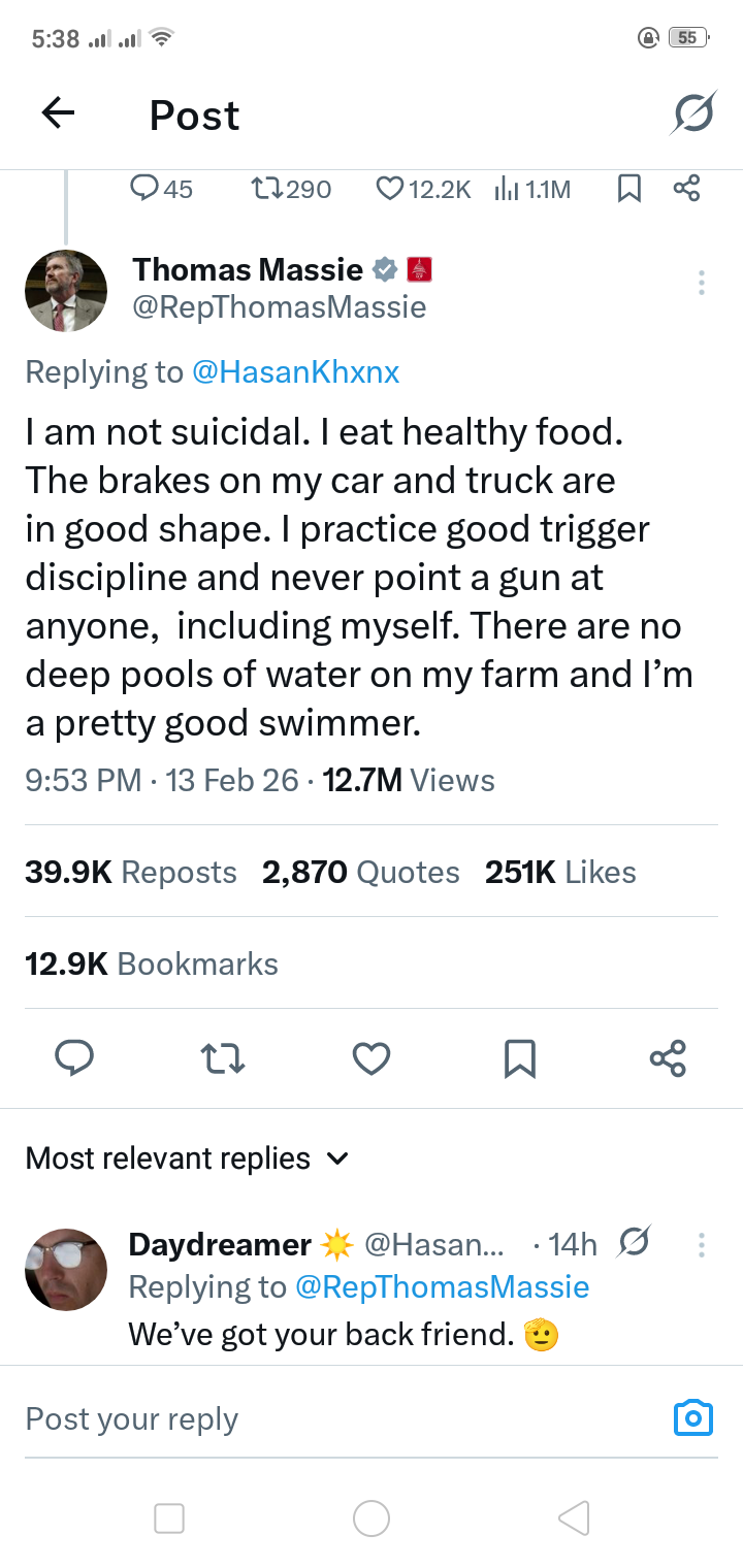 توماس ماسي (السيناتور اللي تسبب بنشر ملفات ابستين) نشر تغريدة مهمة على منصة x اعتبرها المحللون خطيرة جاء فيها: