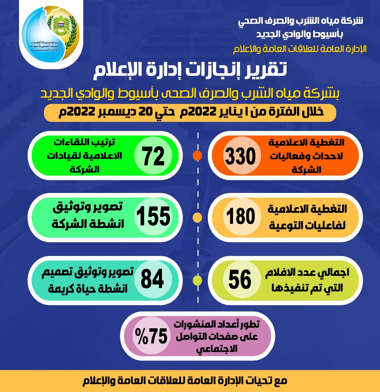 استعرض مركز اعلام شركة مياه الشرب والصرف الصحي بأسيوط والوادي إنجازات البوابه الأولى للتواصل مع المواطنين خلال عام ٢٠٢٢ .وحقق المركز الإعلامي لشركة مياه الشرب والصرف الصحي بأسيوط والوادي الجديد طفرة مشهودة خلال العام الحالي والذي أوشك أن ينقضي بعد مرور عدة أيام ليواصل المركز الإعلامي إنجازاته خلال العام الجديد بلمحات تقنية وإعلامية جديدة يسعى من خلالها إلى تدعيم قنوات التواصل مع العملاء الكرام وترسيخ جسور الثقة بينهم وبين مختلف الأيدي العاملة في خدمة المواطنين من أبناء مياه أسيوط