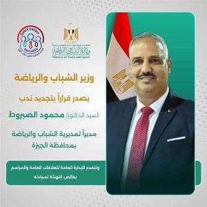 تتقدم أسرة جريدة وموقع “وضوح الإخباري” بأسمى آيات التهاني والتبريكات للدكتور محمود الصبروط على تجديد الثقة وتكليفه مجددًا مديرًا لمديرية الشباب والرياضة بمحافظة الجيزة، مع خالص الأمنيات له بدوام التوفيق والسداد في خدمة الوطن وشبابه، ومزيد من النجاحات والعطاء.