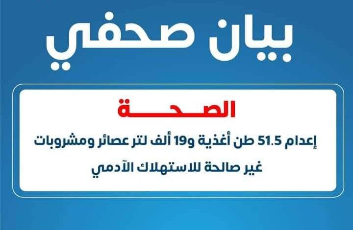 الصحة تعدم 51.5 طن أغذية و19 ألف لتر عصائر ومشروبات غير صالحة للاستهلاك الآدمي