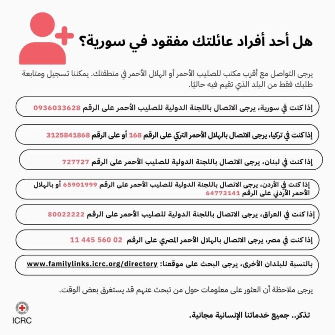 • في سوريا: الاتصال باللجنة الدولية للصليب الأحمر على الرقم: 0936033628