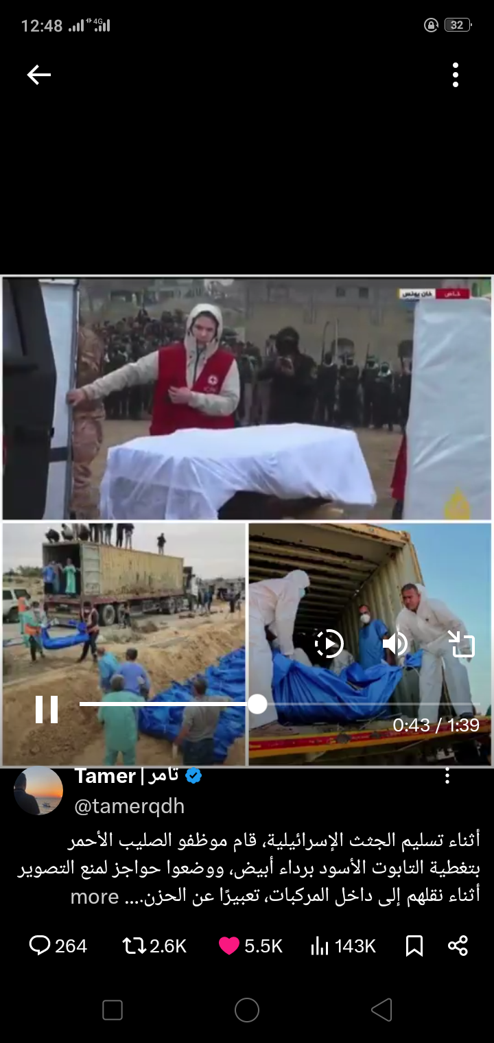 بينما يُجري “الصليب الأحمر” مراسم رسمية مُهيبة عند تسلُّم جثث الأسرى الإسرائيليين، يُسلِّم جثامين الشهداء الفلسطينيين في أكياس زرقاء تُلقى داخل شاحنات تفتقر لأبسط مقومات الكرامة الإنسانية. هذا التمييز الصارخ في التعامل يعكس ازدواجية المعايير ويفضح العجز الدولي عن تحقيق العدالة والإنصاف!
