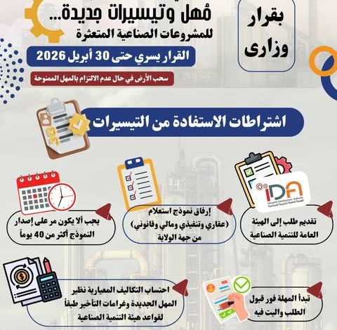 دعت الهيئة العامة للتنمية الصناعية جميع المستثمرين الصناعيين الراغبين في الاستفادة من هذه التيسيرات إلى سرعة التقدم بطلباتهم قبل نهاية أبريل 2026، مؤكدة التزامها بسرعة البت في الطلبات وتقديم الدعم اللازم لضمان نجاح المشروعات.