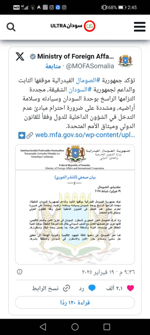 وأعربت وزارة الخارجية الصومالية، فى بيان، عن تضامنها الكامل مع الشعب السودانى فى ظل المرحلة الدقيقة التى يمر بها، مؤكدةً أهمية الحفاظ على مؤسسات الدولة والسلطة الشرعية لضمان وحدة البلاد واستقرارها.