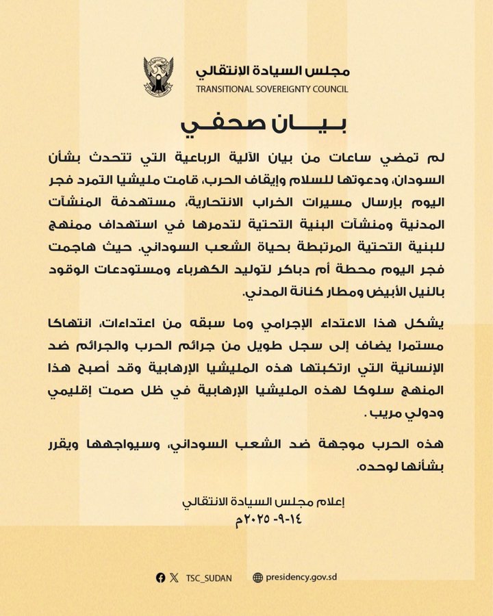 وجاء في إعلان الدول الأربع أن “مستقبل الحكم في السودان يقرره الشعب السوداني، ويجب ألا يسيطر عليه أي من الأطراف المتحاربة” وهو ما رفضته الحكومة السودانية.