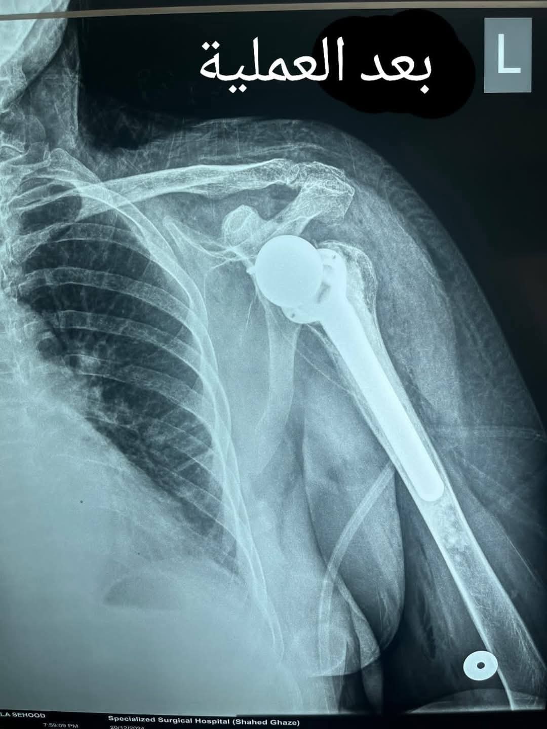وبين رئيس الفريق الطبي الاستشاري الدكتور محمد سعيد محمد ان المريضة راجعت المستشفى وكانت تعاني من سوفان متقدم للكتف الايسر مع الم شديد في حركة المفصل وبعد اجراء الفحوصات الطبية اللازمة تم اجراء عملية لتبديل مفصل الكتف الصناعي المعكوس وتكللت بنجاح والمريضة بصحة جيدة بجهود الفريق الطبي والتمريضي والصحي الساند في المستشفى ٠