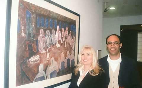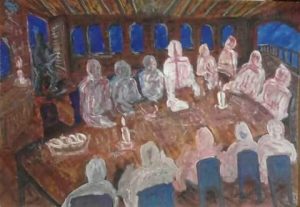 * لوحة ” العشاء الأخير ” ، أبعادها ( ١٠٠ × ٧٠ سم )  الوان جواش على كرتون.