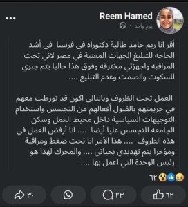 وأشارت ريم في منشوراتها إلى أنها تعرضت لمضايقات وكانت تشعر دائماً بالملاحقة والمراقبة، بالإضافة إلى محاولة اختراق أجهزتها الإلكترونية.