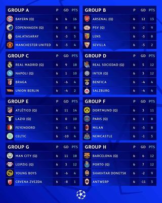 آخر ترتيب للفرق بعد نهاية منافسات المجموعات، صعد الأول والثاني من كل مجموعة إلي دور السادس عشر لدورى أبطال أوروبا، وتحول صاحب المركز الثالث إلي منافسات الدورى الاوربي.