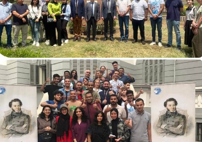 كما ألقى طلاب قسم اللغة الروسية بجامعة القاهرة وكلية الالسن جامعة عين شمس مجموعة من أشعار بوشكين باللغة الروسية حيث أشاد بهم الوفد الروسي .