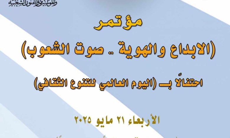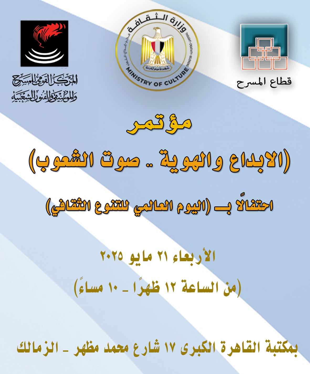 تحت رعاية الأستاذ الدكتور أحمد فؤاد هنو وزير الثقافة، وإشراف المخرج الفنان خالد جلال رئيس قطاع المسرح، ينظم المركز القومي للمسرح والموسيقي والفنون الشعبية، برئاسة المخرج عادل حسان مؤتمرًا علميًا واحتفالية فنية ثقافية لمناسبة اليوم (العالمي للتنوع الثقافي) الذي يوافق الأربعاء القادم 21مايو2025