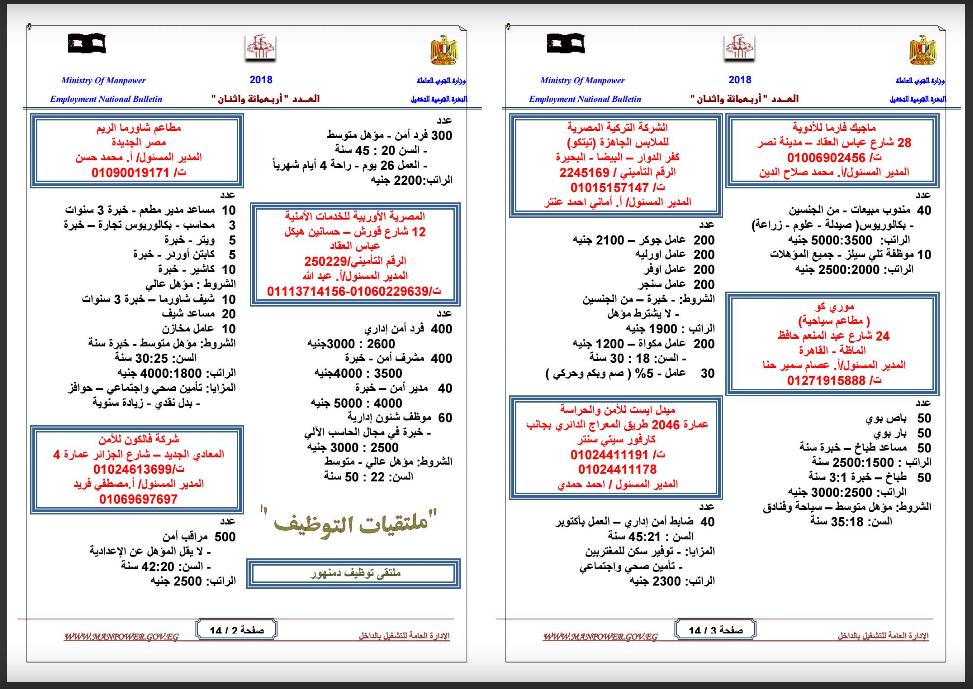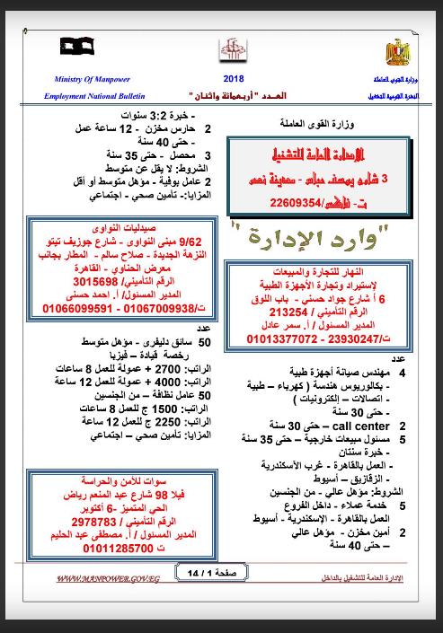 أعلنت وزارة القوى العاملة، اليوم الثلاثاء 1 يناير 2019 ، أول أيام العام الجديد، عن توفير آلاف فرص العمل للشباب في العديد من القطاعات والمجالات، وبأجور متفاوتة، وذلك وفقًا للنشرة القومية للتشغيل الصادرة من الوزارة.