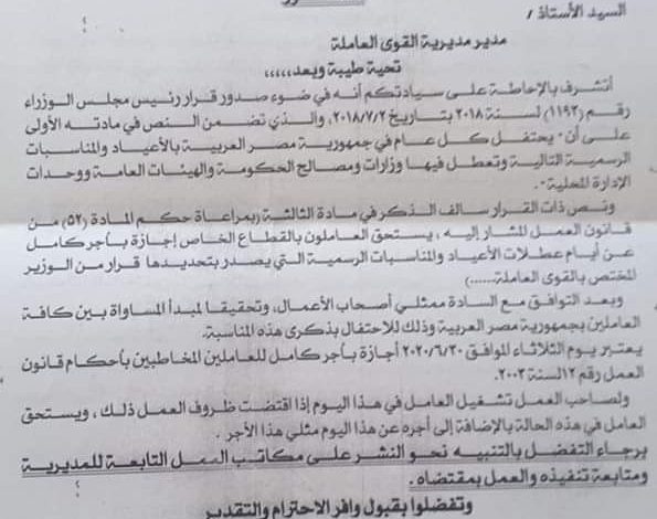 القوى العاملة 30 يونيه أجازة بأجر كامل.