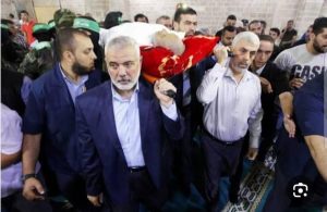 وارفق التعليق بصورة ذات دلالة واضحة يظهر فيها الشهيدان هنية والسنوار ( اثناء حياتهما يرحمهما الله ) وهما يحملان جثمان قيادي فلسطيني شهيد أثناء تشييعه .