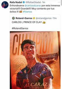 كارلوس الكاراز يتوج لاول مرة ببطولة رولان غاروس للتنس بعد مباراة حماسية و ممتعة دامت 4 ساعات و 19 دقيقة انتهت بفوزه على الالماني زفيريف 2/3