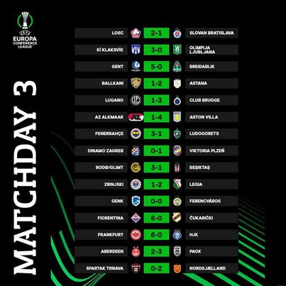 أهم أحداث منافسات الجولة الثالثة للمؤتمر الأوربي فقد اكتسح نادي استون فيلا الإنجليزي نادي اي زد الكمار الهولندي بخماسية، وحقق نادي انتراخنت فرانكفورت فوز كبير بخماسية ليبقي خلف المتصدر ،وحقق نادي ليل الفرنسي فوز وانتصر نادي فيورنتينا الإيطالي فوز كبير بسداسية .المجموعة الثامنة فاز نادي فنار باخشة التركي.