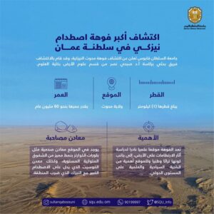 ذكرت وكالة الأنباء العُمانية اليوم الاثنين 19 ديسمبر 2022 أن قسم علوم الأرض بكلية العلوم جامعة السُّلطان قابوس، أعلن عن اكتشاف فوّهة نيزكيّة هائلة يبلغ قطرها كيلومتر واحد في ولاية محوت بسلطنة عُمان.