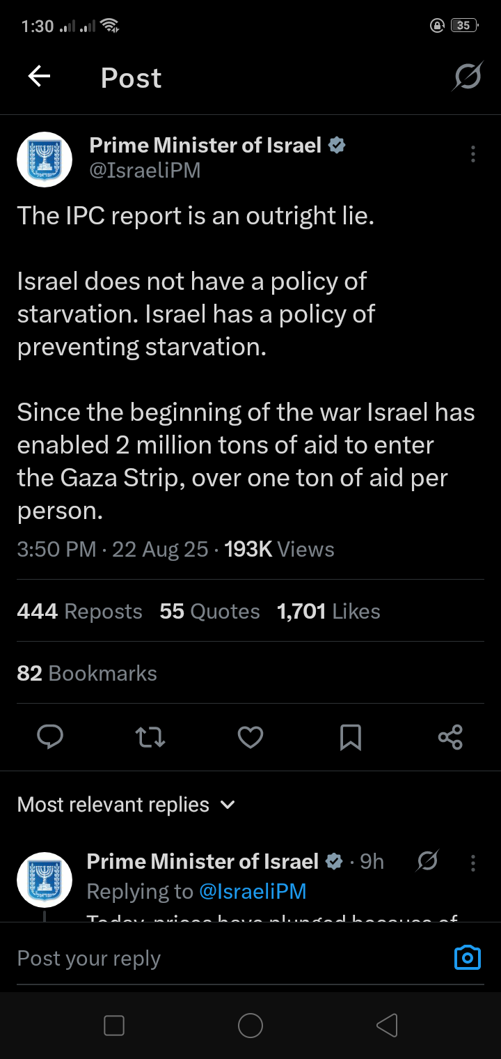 وزعم نتنياهو في بيان صادر عن مكتبه إن “التصنيف المرحلي المتكامل للأمن الغذائي هو كذب صريح”، في إشارة إلى تقرير هيئة الخبراء المدعومة من الأمم المتحدة. وأضاف “إسرائيل لا تعتمد سياسة تجويع، بل سياسة منع الجوع. فمنذ بداية الحرب، سمحت إسرائيل بدخول مليوني طن من المساعدات إلى قطاع غزة، أي ما يزيد على طن واحد من المساعدات لكل فرد”، مشيرًا الى أن المساعدات بقيت تدخل القطاع المحاصر خلال الحرب.
