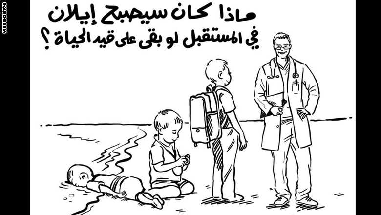 وعلقت الملكة رانيا على الرسم الذي نفذه الرسام الاردني اسامة حجاج باللغات العربية والانجليزية والفرنسية بقولها “كان من الممكن ان يصبح ايلان طبيبا أو معلما أو أبا حنونا”.
