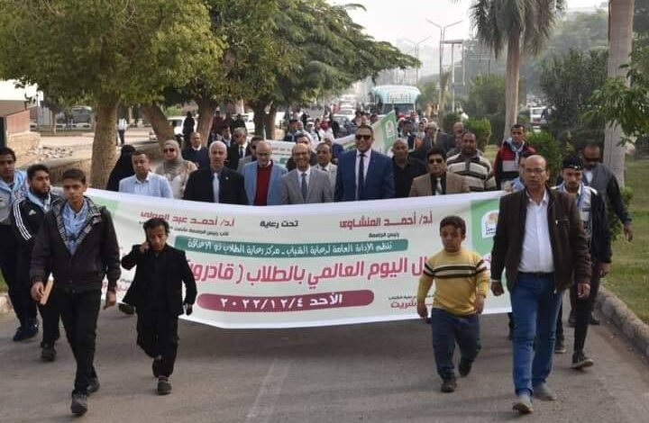 القائم بعمل رئيس جامعة أسيوط مسيرة طلابية تحت شعار قادرون باختلاف والتى نظمتها الادارة العامة لرعاية الشباب بالتعاون مع مركز رعاية ذو الاعاقة بالجامعة تزامنا مع الاحتفال باليوم العالمى لذوى الاحتياجات الخاصة والتى انطلقت من القرية الاولمبية بالأستاد الرياضى الى مركز رعاية ذو الاعاقة