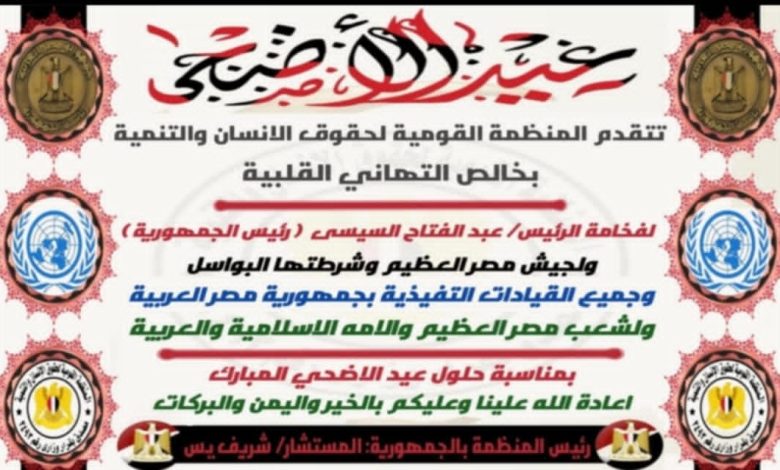 تقدمت المنظمة القومية لحقوق الإنسان والتنمية، برئاسة المستشار شريف يس، بخالص التهاني القلبية إلى فخامة الرئيس عبد الفتاح السيسي، وإلى قواتنا المسلحة الباسلة وشرطتنا الوطنية، وإلى شعب مصر العظيم، والأمتين العربية والإسلامية، بمناسبة حلول عيد الأضحى المبارك.