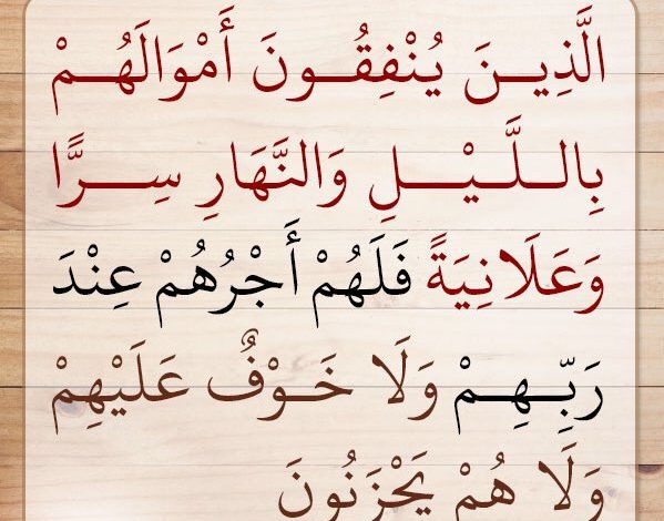 “الَّذِينَ يُنفِقُونَ أَمْوَالَهُم بِاللَّيْلِ وَالنَّهَارِ سِرًّا وَعَلَانِيَةً فَلَهُمْ أَجْرُهُمْ عِندَ رَبِّهِمْ وَلَا خَوْفٌ عَلَيْهِمْ وَلَا هُمْ يَحْزَنُونَ”.