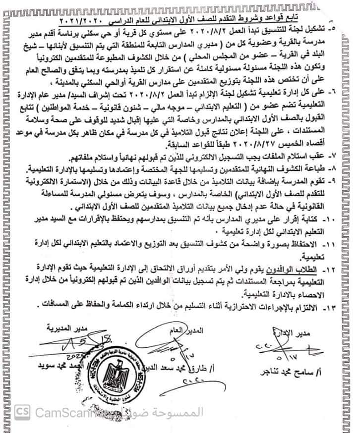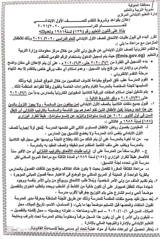 أوضح الدكتور أحمد سويد مدير مديرية التربية والتعليم بالمنوفية أنه تم فتح باب القبول لطلبات الالتحاق للصف الأول الإبتدائى لعام ٢٠٢٠_ ٢٠٢١ تحت ضوابط وهى :